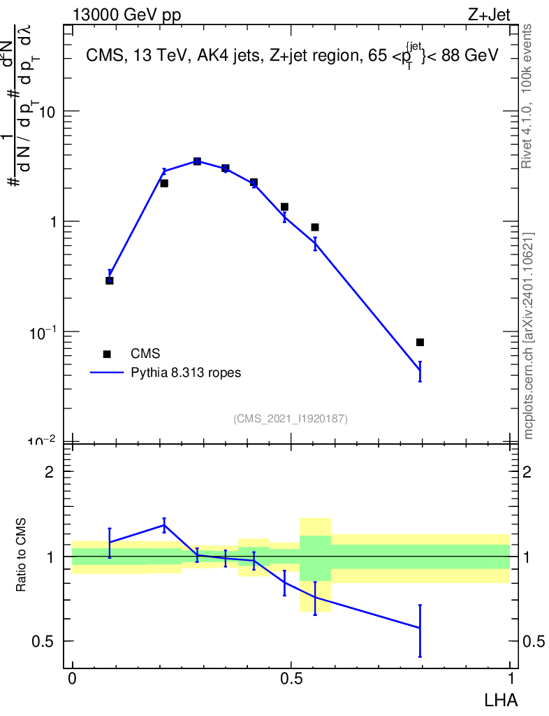 Lines: data, pythia8 8.313 ropes |