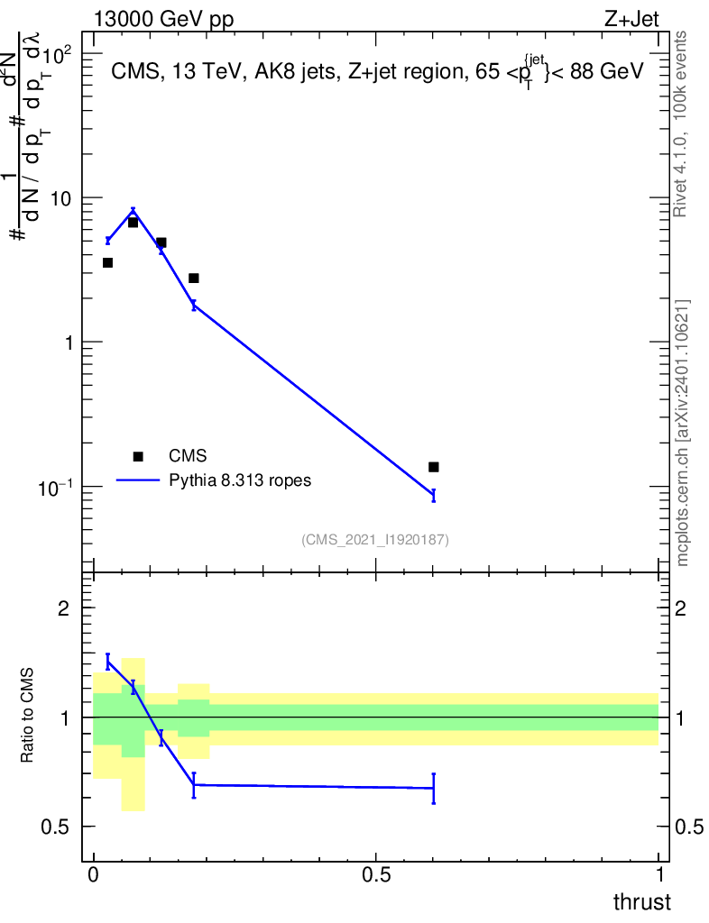 Lines: data, pythia8 8.313 ropes |