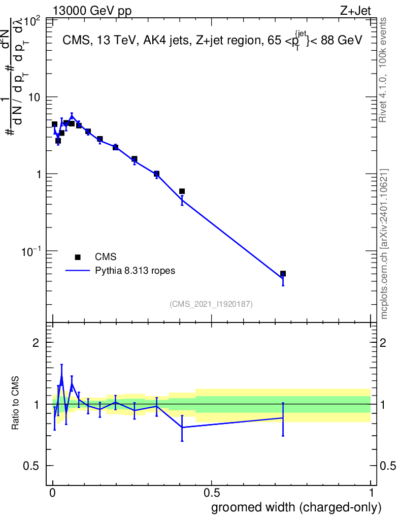 Lines: data, pythia8 8.313 ropes |