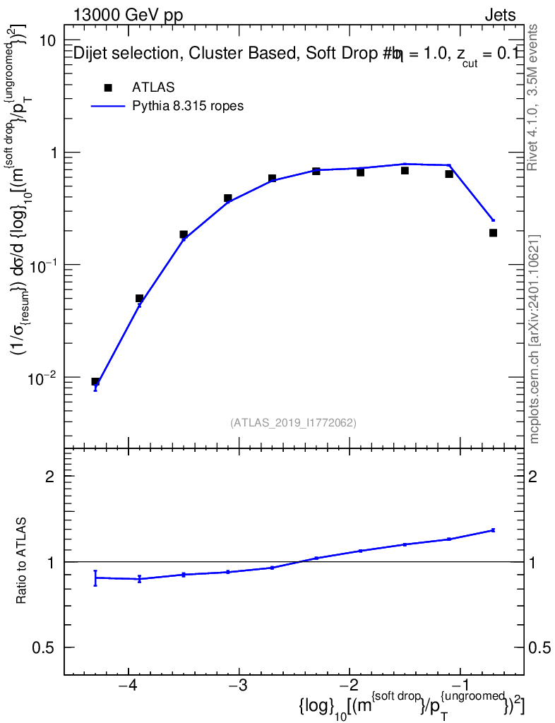 Lines: data, pythia8 8.315 ropes |