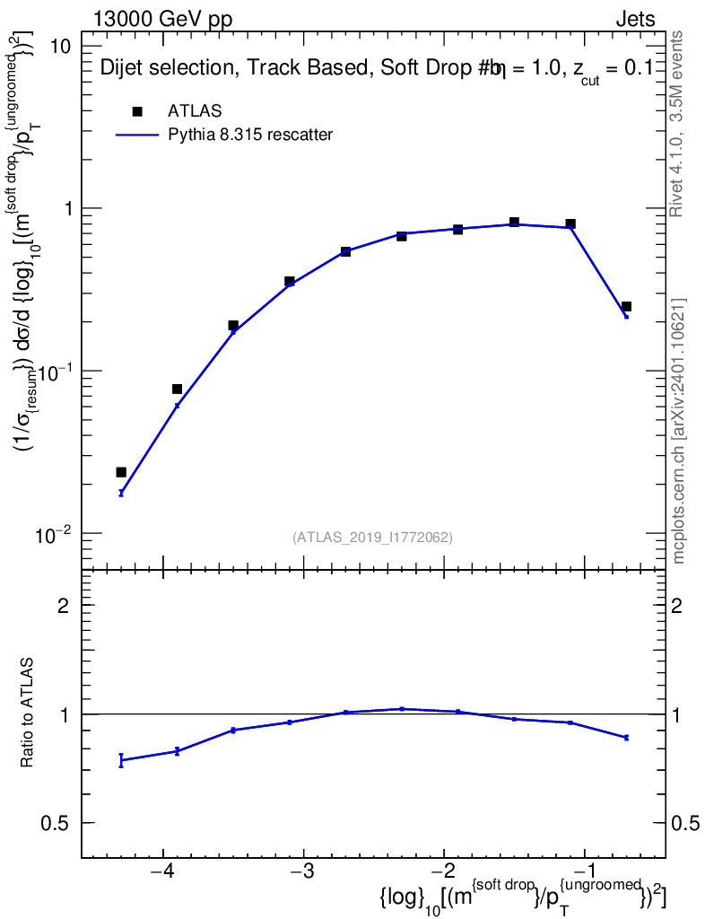 Lines: data, pythia8 8.315 rescatter |