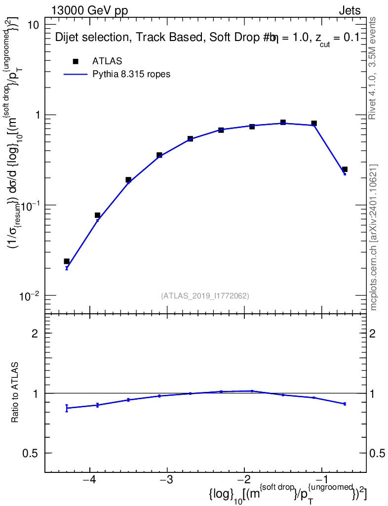 Lines: data, pythia8 8.315 ropes |