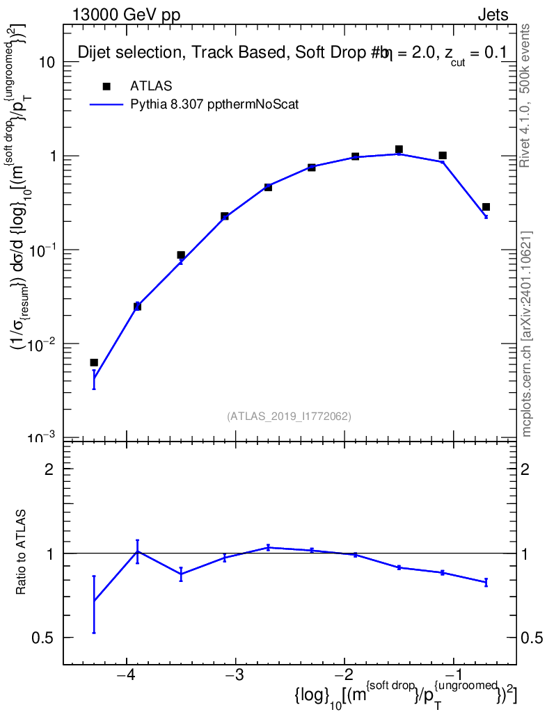 Lines: data, pythia8 8.307 ppthermNoScat |