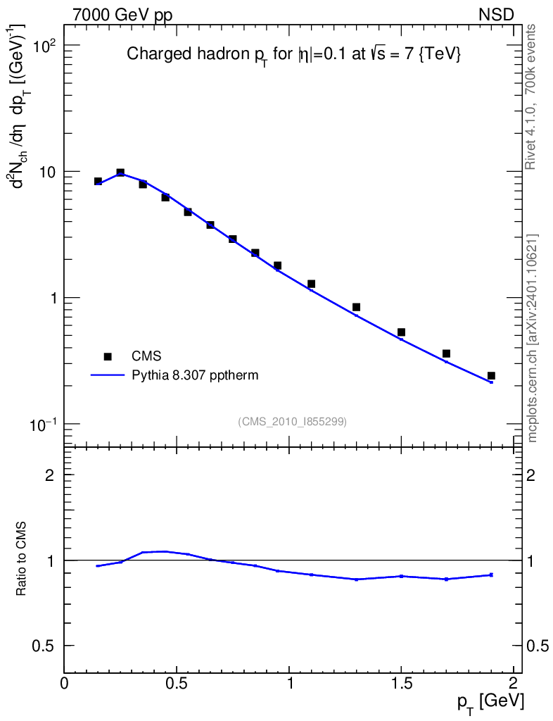Lines: data, pythia8 8.307 pptherm |