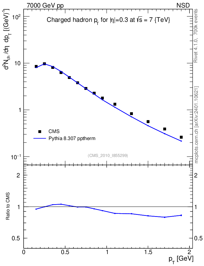Lines: data, pythia8 8.307 pptherm |