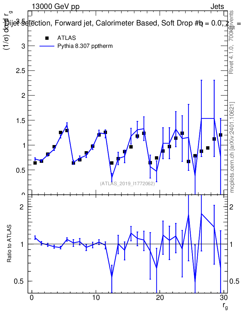 Lines: data, pythia8 8.307 pptherm |