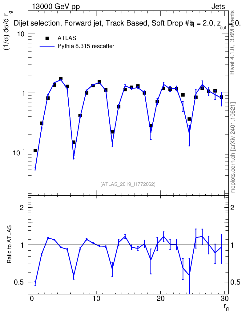Lines: data, pythia8 8.315 rescatter |