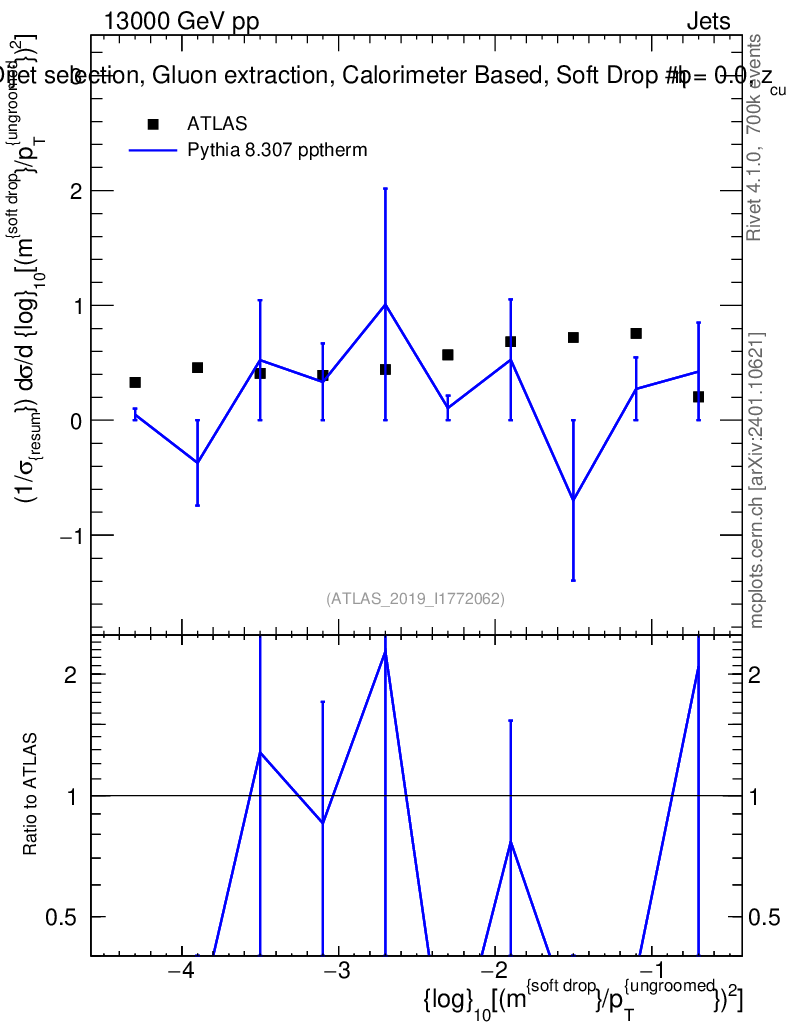 Lines: data, pythia8 8.307 pptherm |