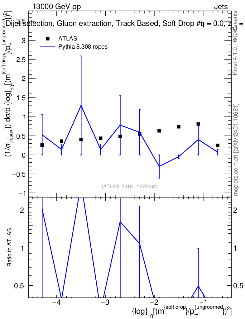 Lines: data, pythia8 8.308 ropes |