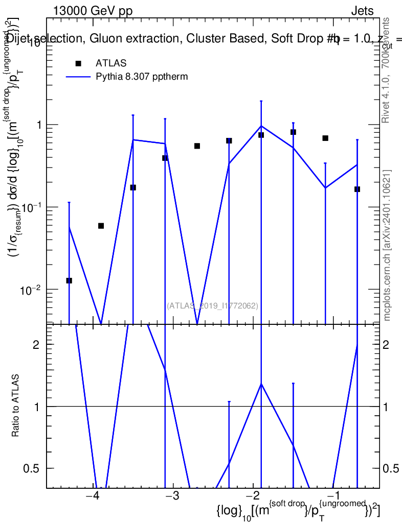 Lines: data, pythia8 8.307 pptherm |