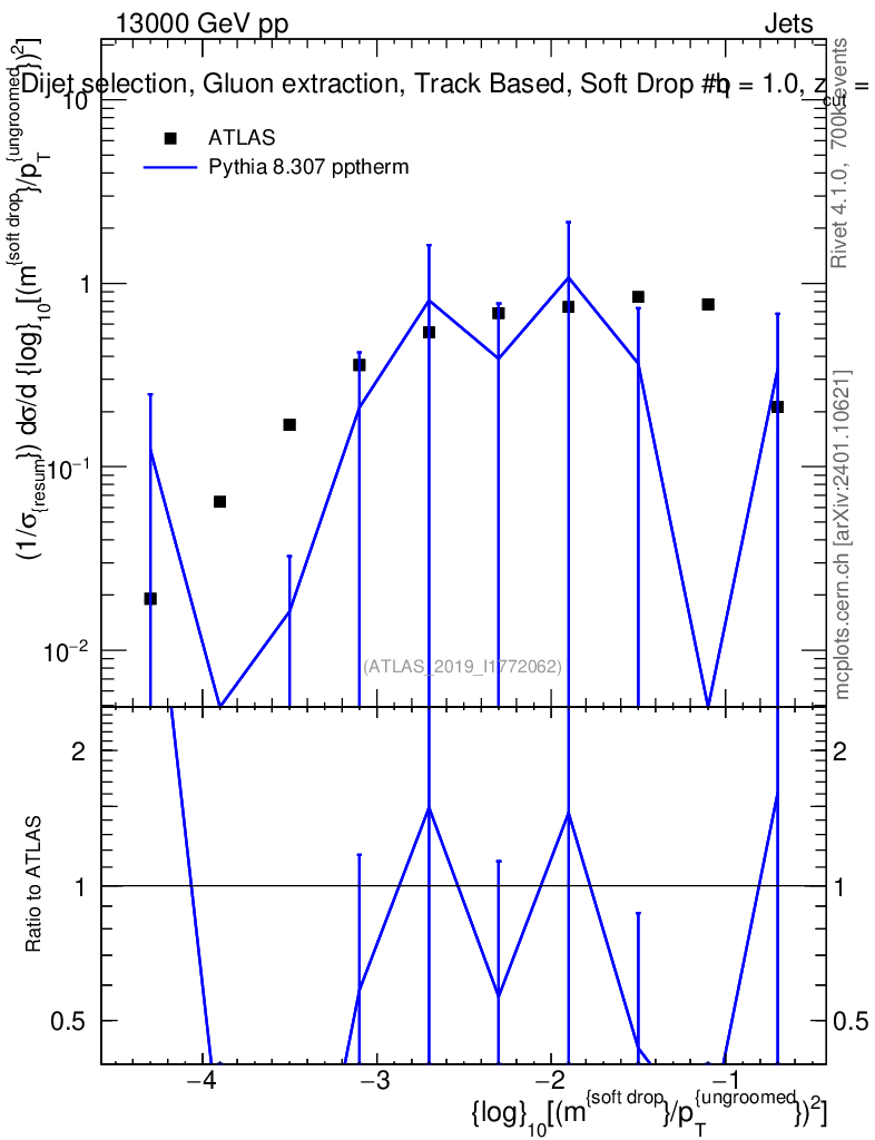 Lines: data, pythia8 8.307 pptherm |