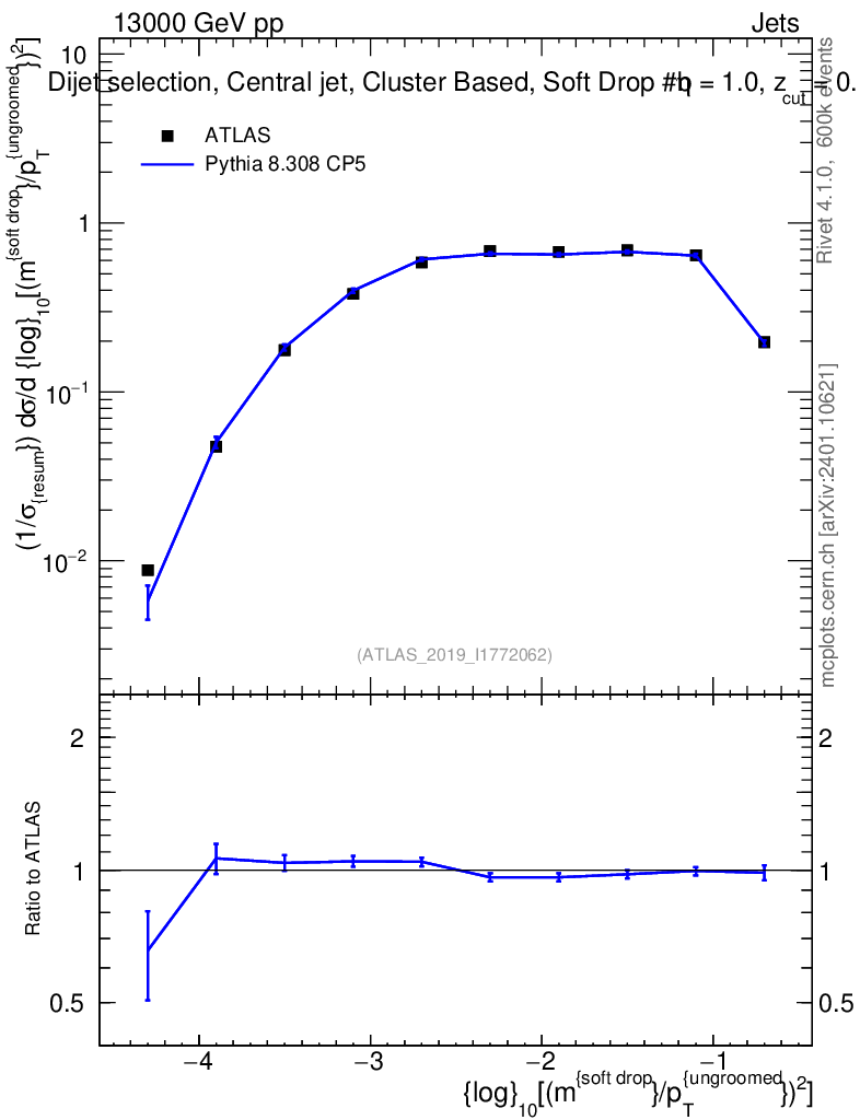 Plot of softdrop.rho in 13000 GeV pp collisions