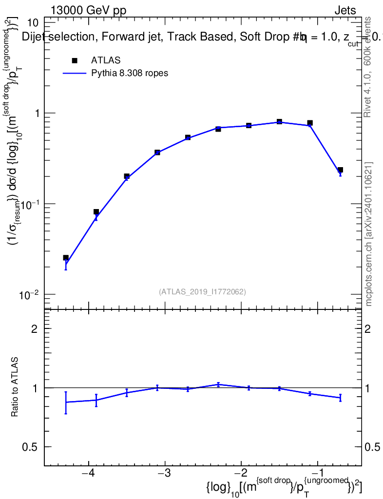 Lines: data, pythia8 8.308 ropes |