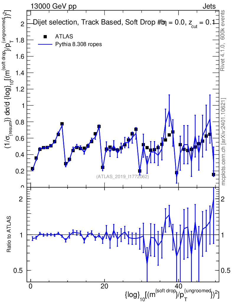 Lines: data, pythia8 8.308 ropes |