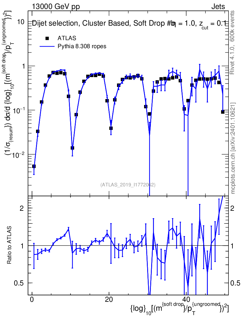 Lines: data, pythia8 8.308 ropes |