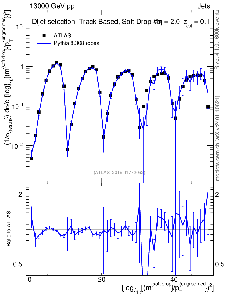 Lines: data, pythia8 8.308 ropes |