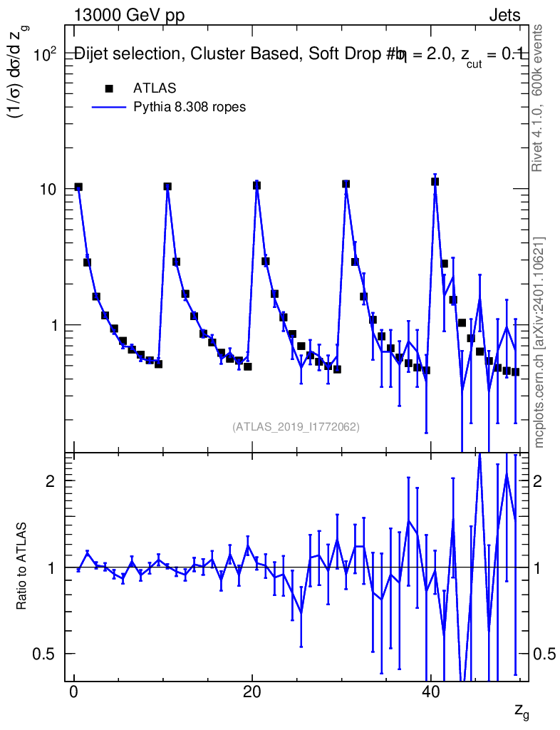 Lines: data, pythia8 8.308 ropes |