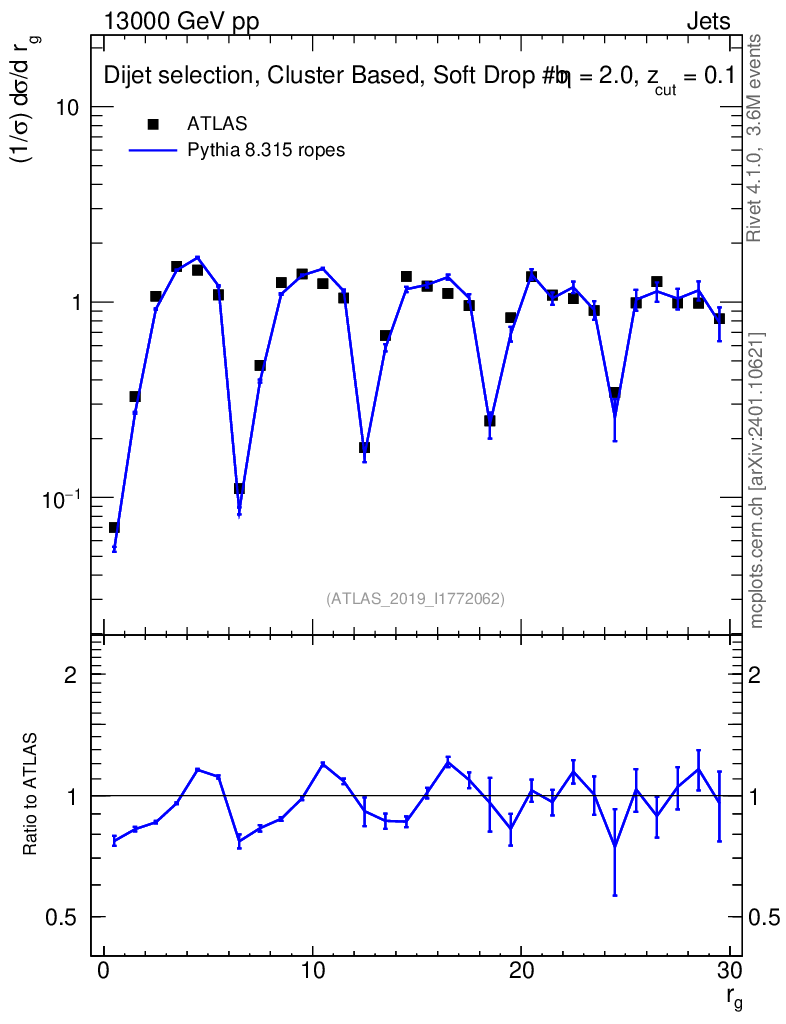 Lines: data, pythia8 8.315 ropes |