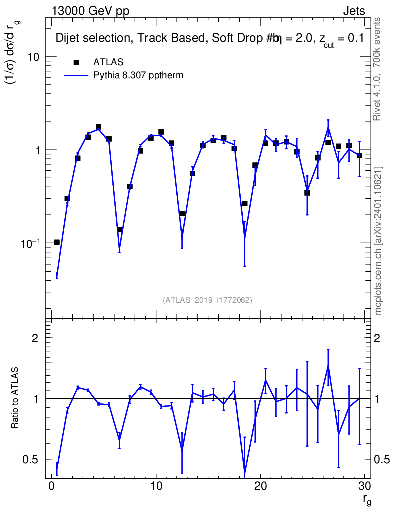 Lines: data, pythia8 8.307 pptherm |