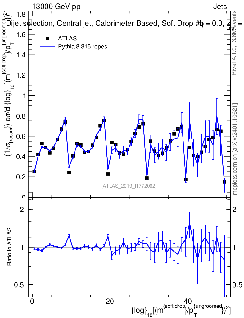 Lines: data, pythia8 8.315 ropes |