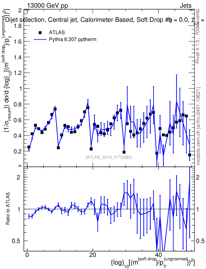 Lines: data, pythia8 8.307 pptherm |