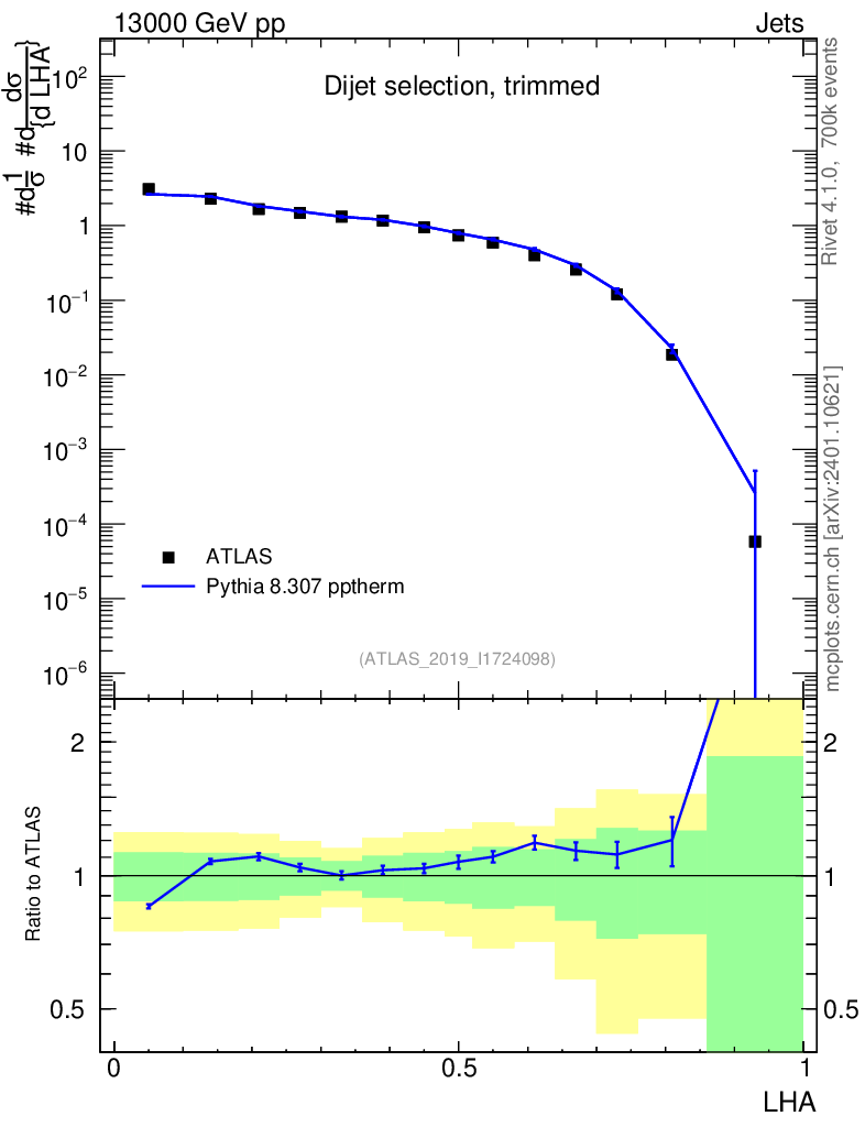 Lines: data, pythia8 8.307 pptherm |
