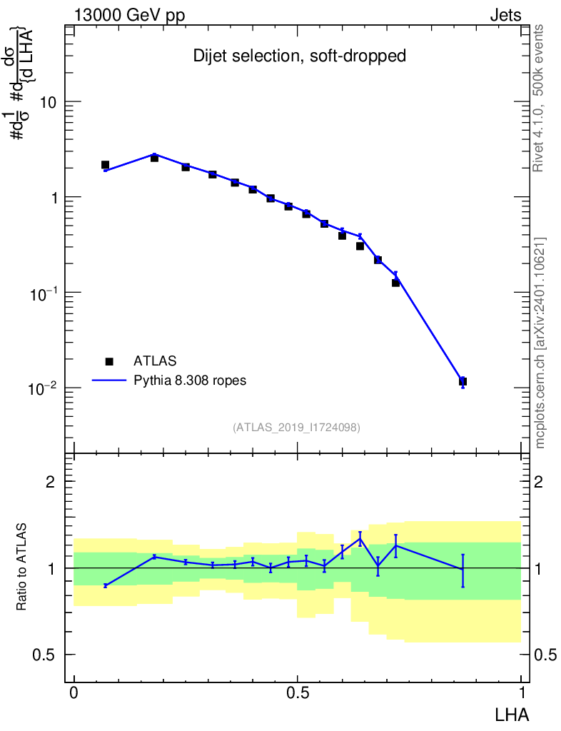 Lines: data, pythia8 8.308 ropes |