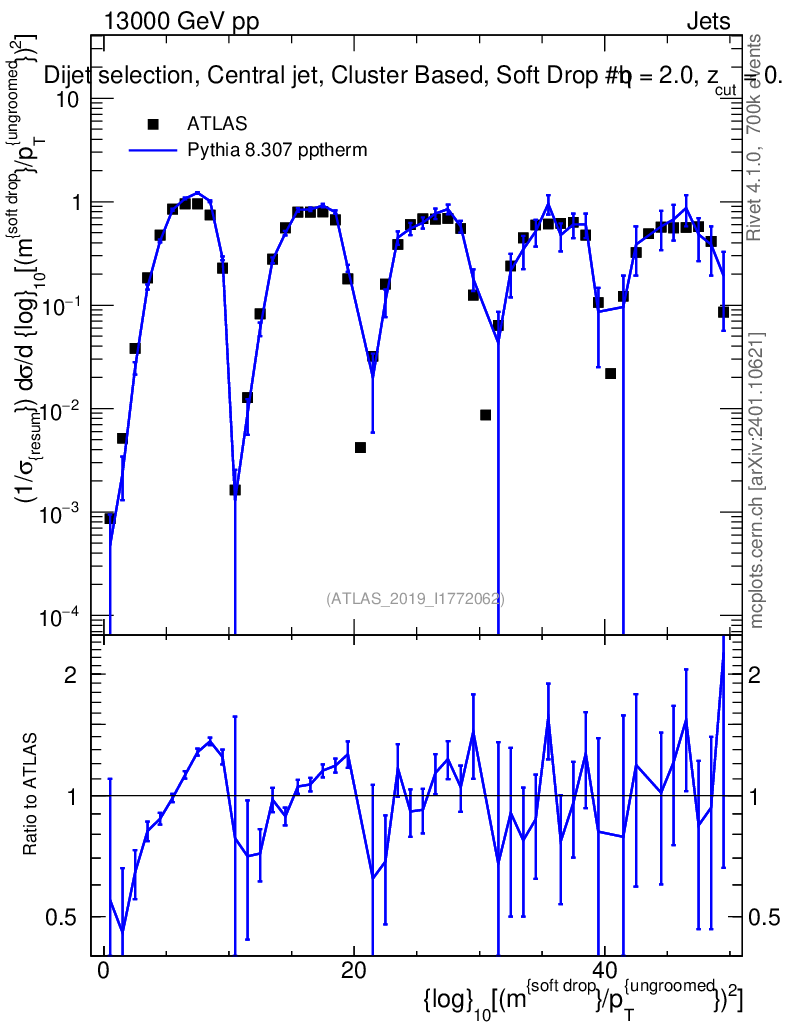 Lines: data, pythia8 8.307 pptherm |