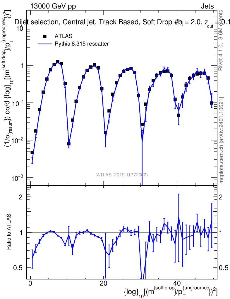 Lines: data, pythia8 8.315 rescatter |