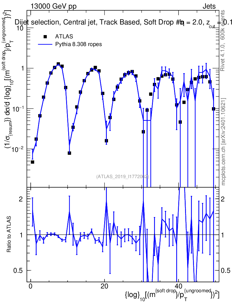 Lines: data, pythia8 8.308 ropes |