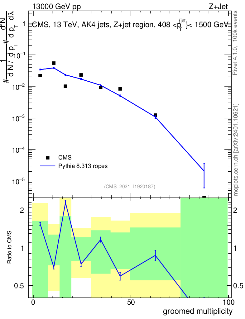 Lines: data, pythia8 8.313 ropes |