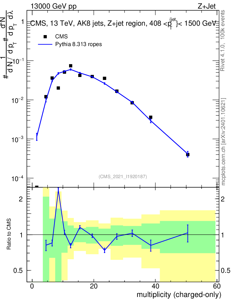 Lines: data, pythia8 8.313 ropes |