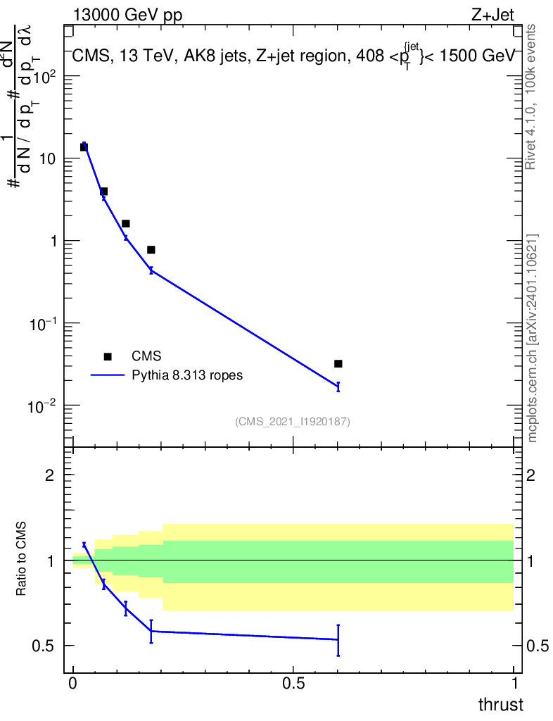 Lines: data, pythia8 8.313 ropes |