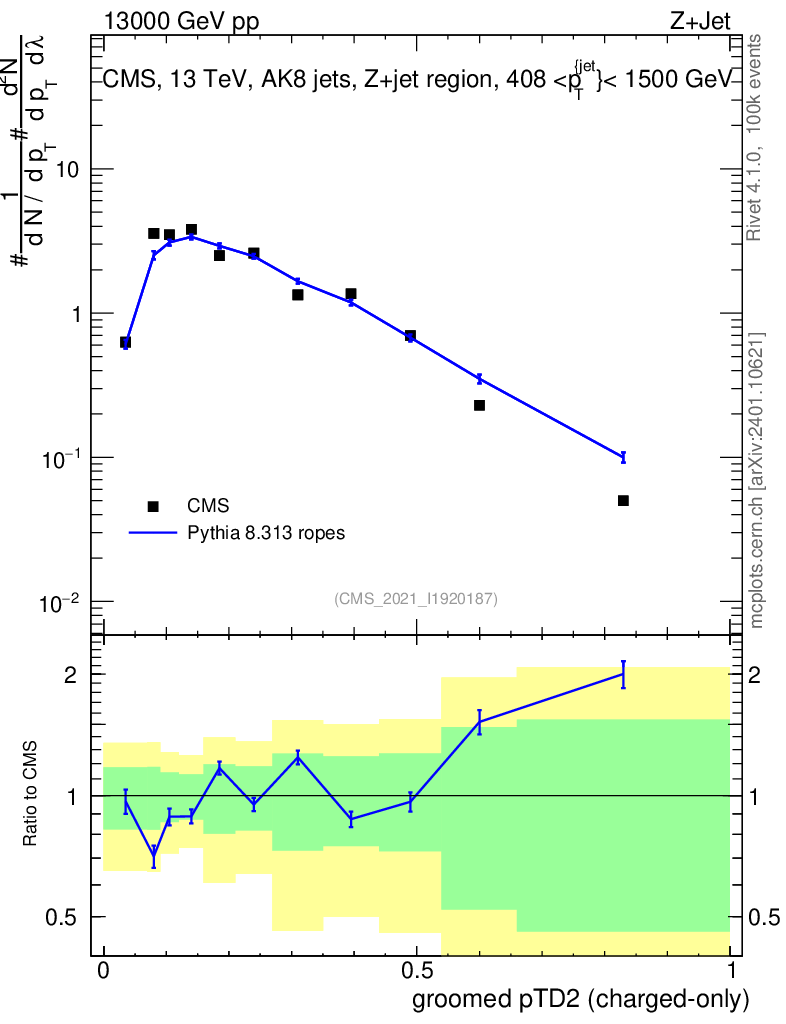 Lines: data, pythia8 8.313 ropes |