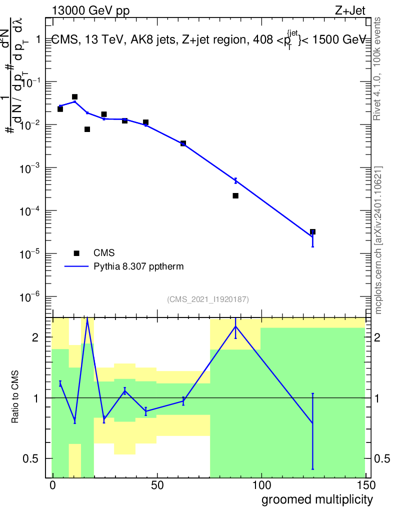 Lines: data, pythia8 8.307 pptherm |