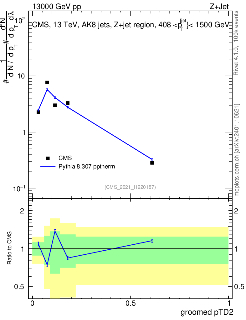 Lines: data, pythia8 8.307 pptherm |