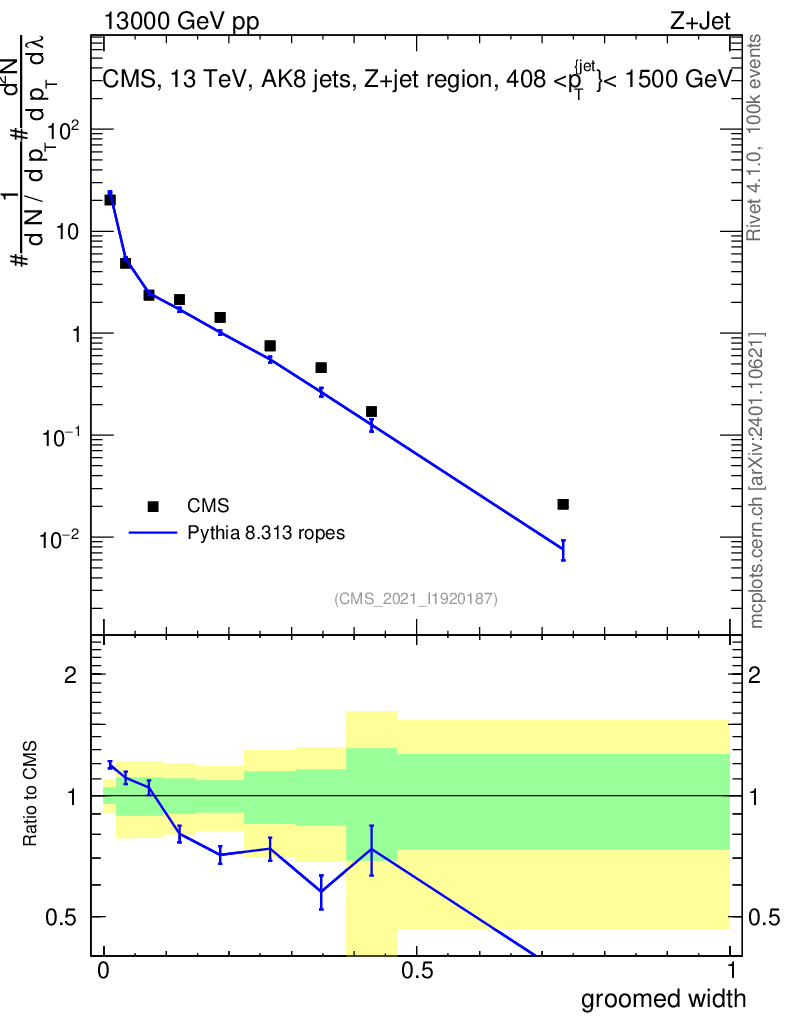 Lines: data, pythia8 8.313 ropes |