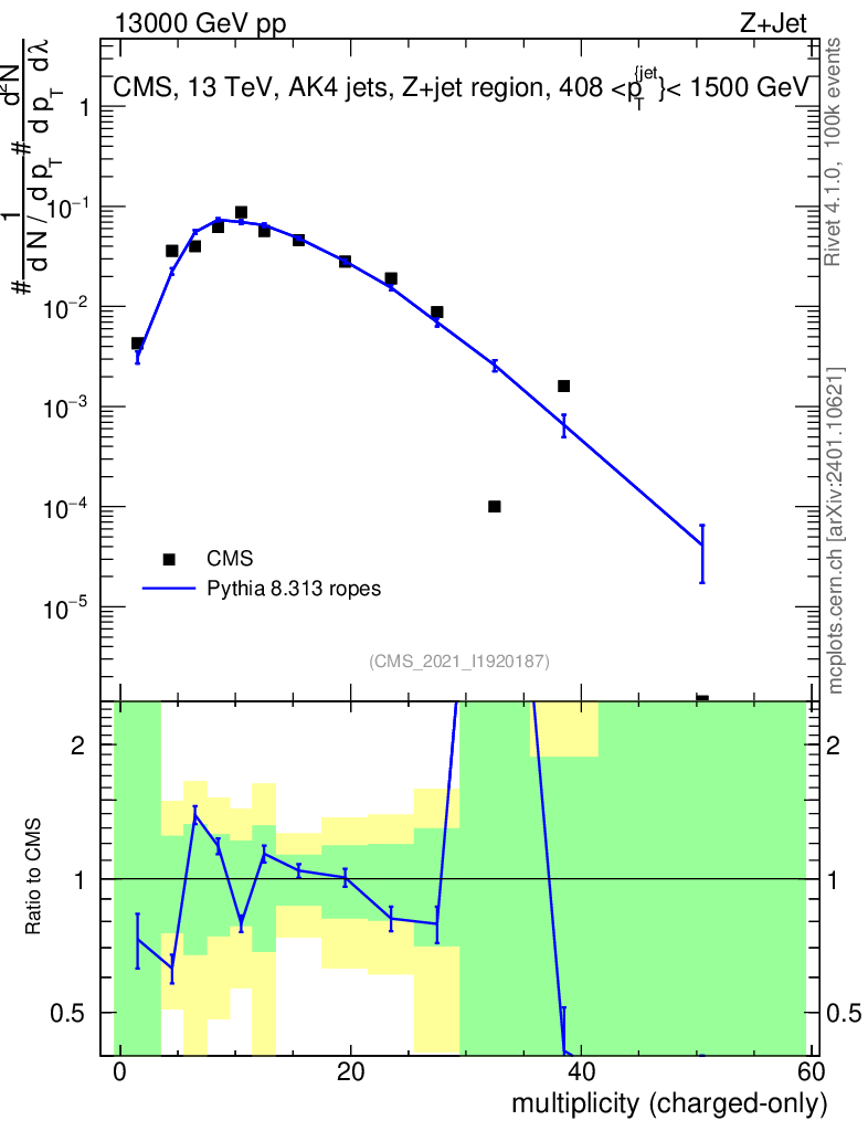 Lines: data, pythia8 8.313 ropes |