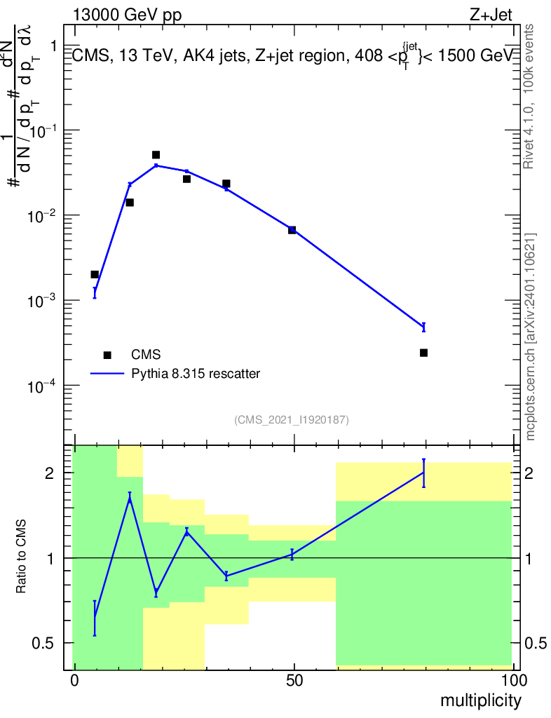 Lines: data, pythia8 8.315 rescatter |
