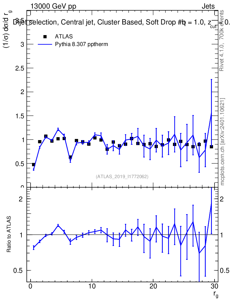Lines: data, pythia8 8.307 pptherm |