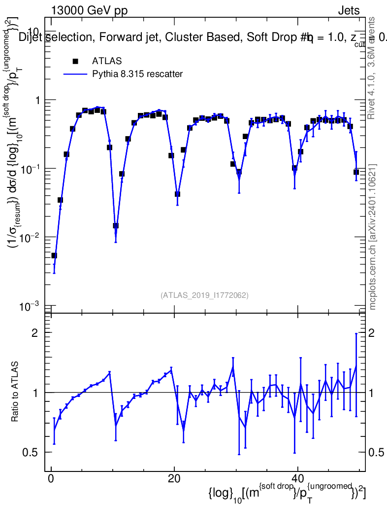 Lines: data, pythia8 8.315 rescatter |