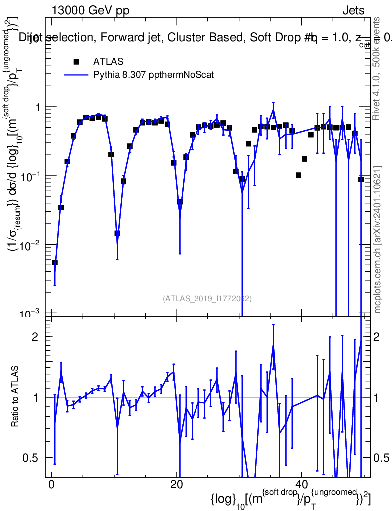 Lines: data, pythia8 8.307 ppthermNoScat |