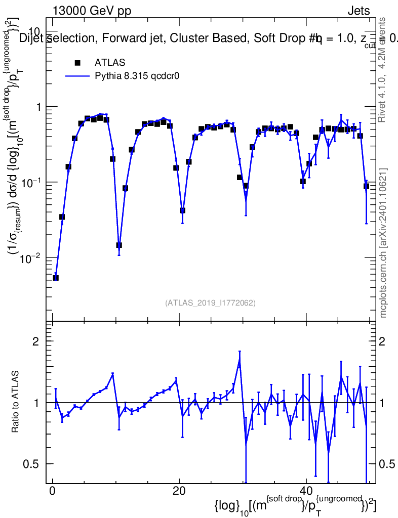 Lines: data, pythia8 8.315 qcdcr0 |