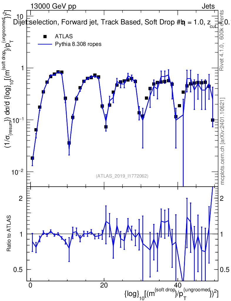 Lines: data, pythia8 8.308 ropes |