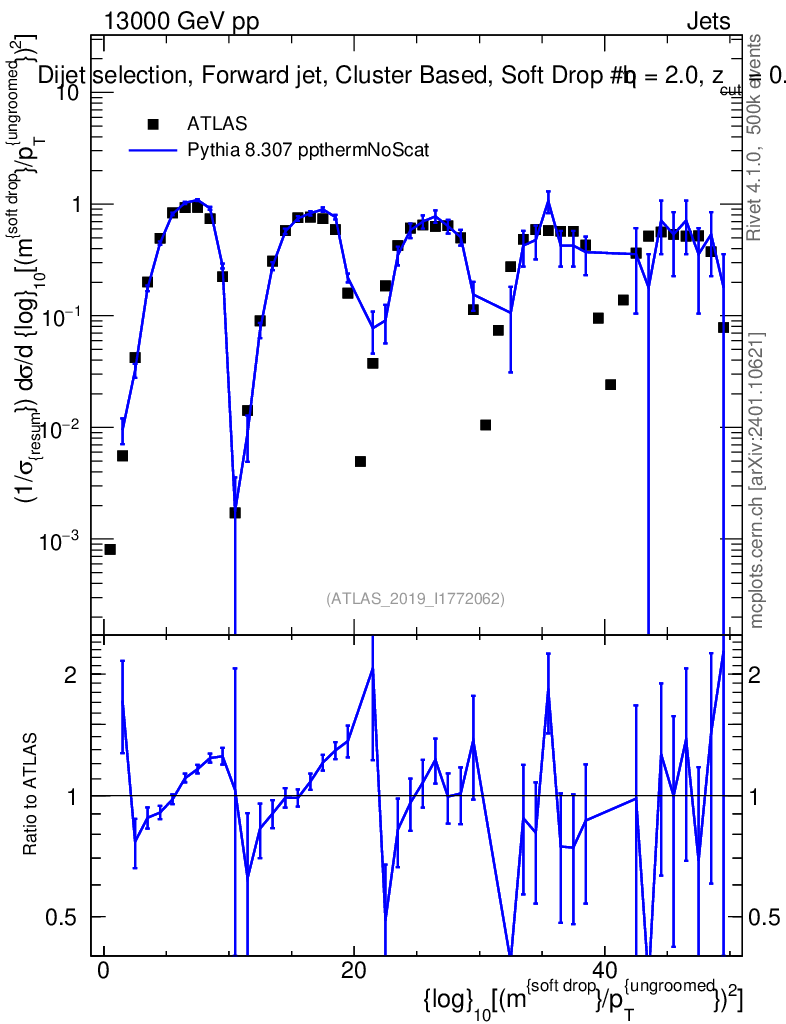 Lines: data, pythia8 8.307 ppthermNoScat |