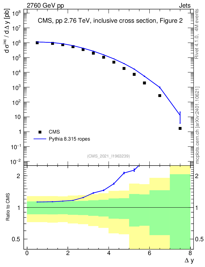 Lines: data, pythia8 8.315 ropes |