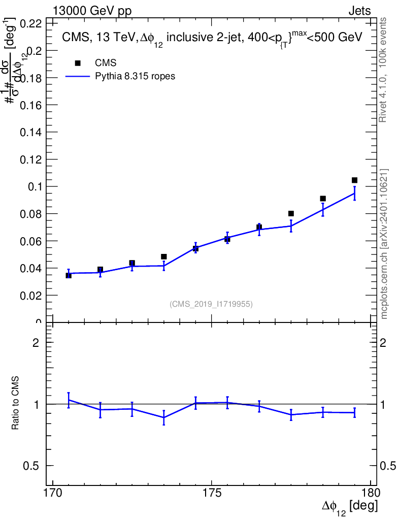 Lines: data, pythia8 8.315 ropes |