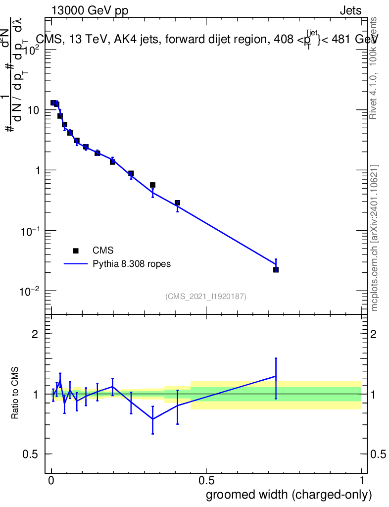Lines: data, pythia8 8.308 ropes |