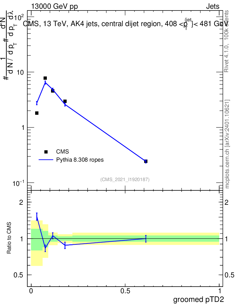 Lines: data, pythia8 8.308 ropes |