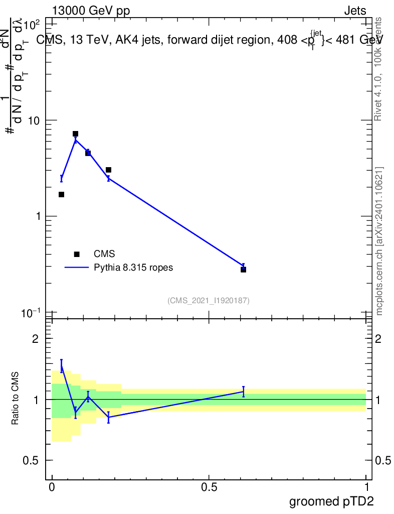 Lines: data, pythia8 8.315 ropes |